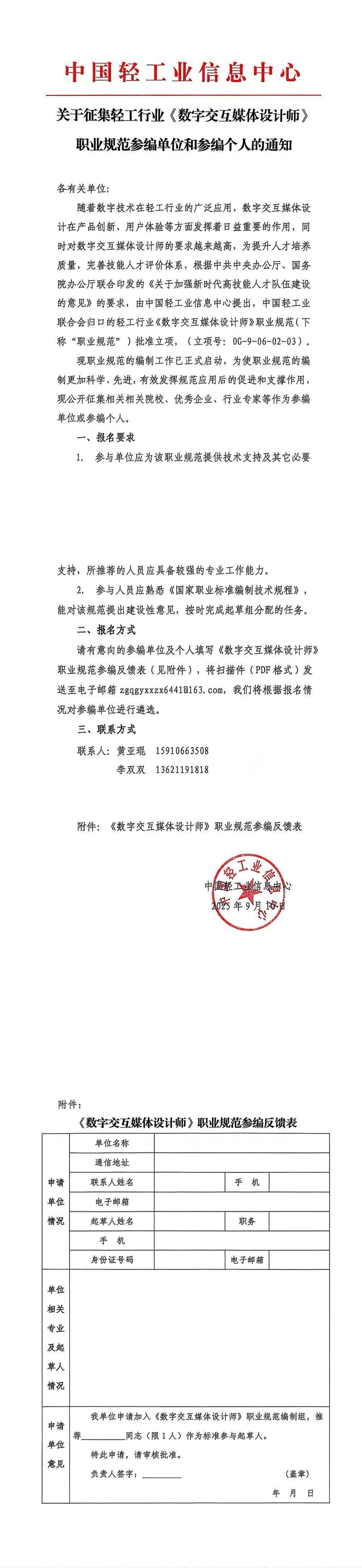关于征集轻工行业《数字交互媒体设计师S》职业规范参编单位和参编个人的通知