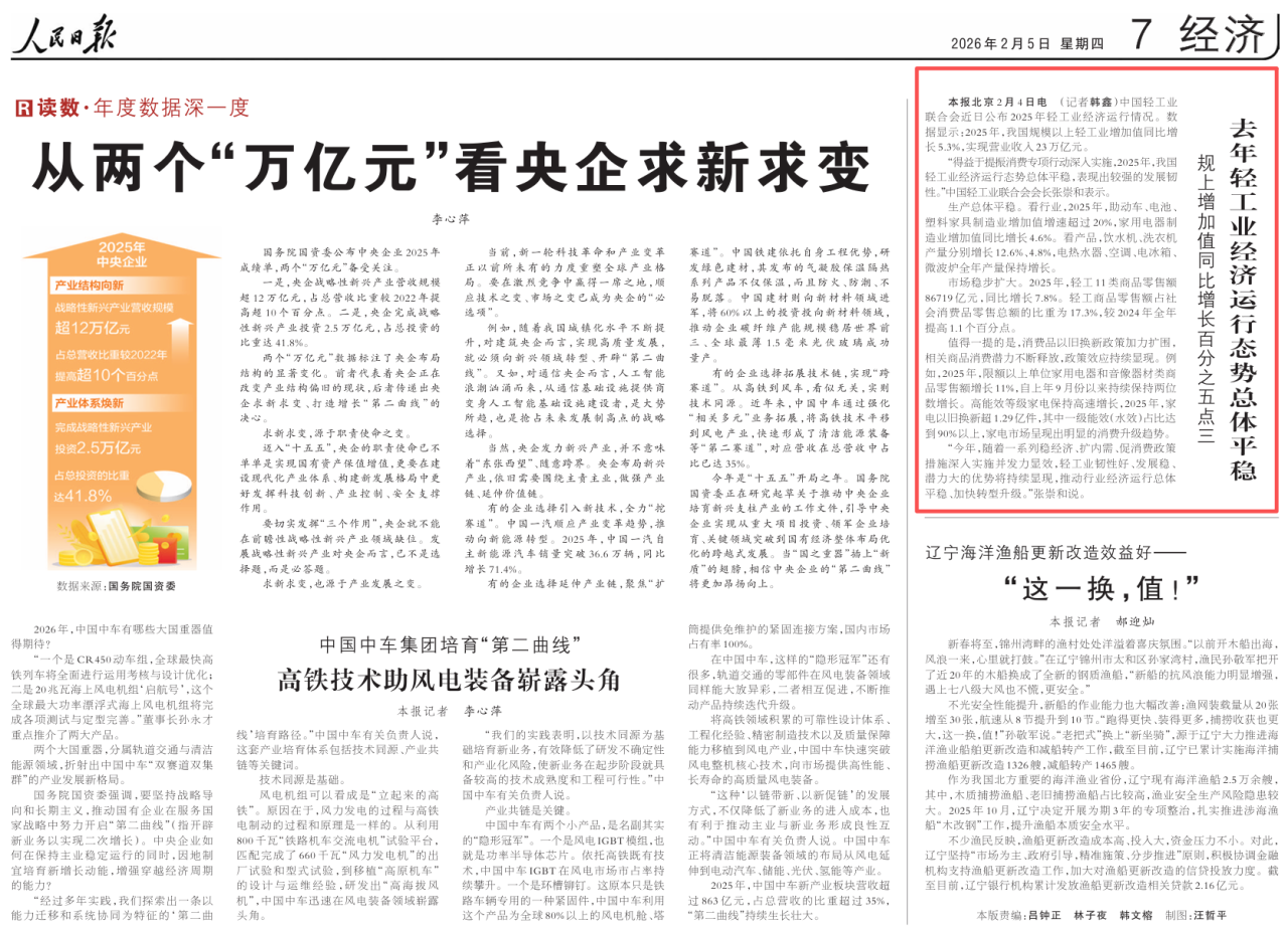 “得益于提振消费专项行动深入实施,2025年,我国轻工业经济运行态势总体平稳,表现出较强的发展韧性。”中国轻工业联合会会长张崇和表示。