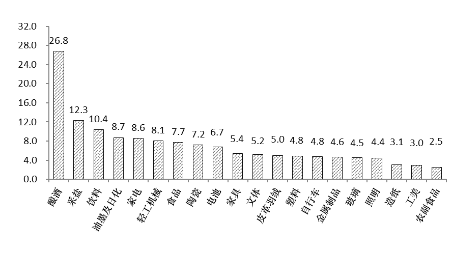 2025年轻工行业规模以上工业企业营业收入利润率为6.04%。其中:酿酒行业营业收入利润率为26.8%,采盐行业营业收入利润率为12.3%,饮料行业营业收入利润率为10.4%,油墨及日化行业营业收入利润率为8.7%,家用电器行业营业收入利润率为8.6%,轻工机械行业营业收入利润率为8.1%,食品制造行业营业收入利润率为7.7%,陶瓷制品业营业收入利润率为7.2%,电池制造业营业收入利润率为6.7%。主要轻工行业营业收入利润率情况见图三。