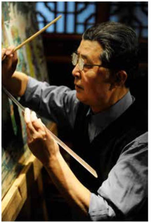 方复出身于书香门第,1956 年考入景德镇陶瓷美术技艺学校(景德镇陶瓷学院前身)。五彩斑斓的古彩深深吸引着这个天资聪颖的学子,在校时他刻苦学习,认真掌握古彩技艺,毕业后因成绩优秀而留校,继续随古彩名家段茂发先生学艺,后又被选送进景德镇陶瓷学院美术系攻读本科,加深了美学修养与技艺修为。方复对古彩有着超常的热爱与透彻的理解,他不惧古彩的繁复精细,而崇古彩的工巧秀丽,他认为古彩是对传统国学文化的精到表达,世界上没有比古彩更适合自己的专业。从花季年华到年逾古稀,60 年来他始终苦乐相伴地耕耘在五彩路上。古彩装饰是一项艺术创作活动,彩绘工艺相当复杂,技术要求全面,画、填、边角、制作细致艰苦,费工费时难度大,与当下的高效率快节奏很难同步,因此许多青年人在选择职业时,都不看好古彩,但方复却一直将学习传承古彩技艺作为人生的唯一追求。无论是毕业后被分配在瓷厂特艺瓷车间,还是在院校教研室,他以集成古彩优秀传统、弘扬古彩国学艺术为己任,专事创作和研究古重彩。