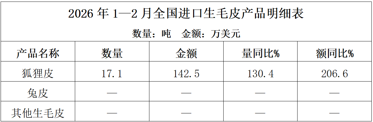 2026年1—2月,全国进口生毛皮产品17.1吨,进口额142.5万美元,同比分别增长1.3倍和2.1倍;产品进口单价83.4美元/千克,同比增长33.1%。