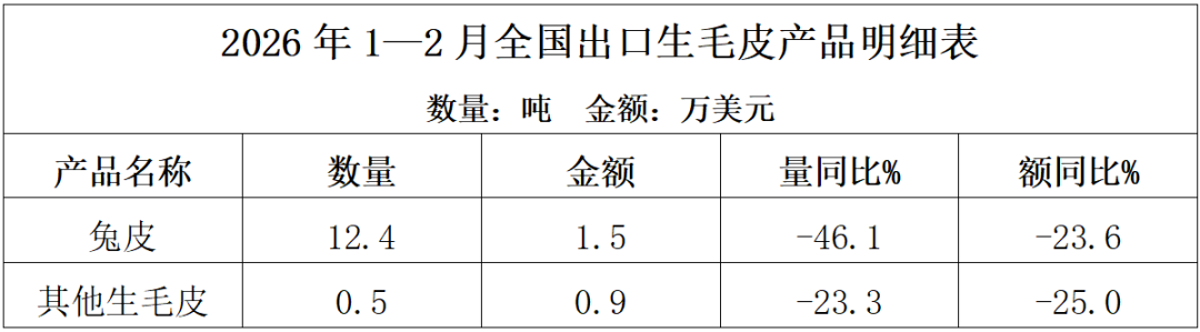 2026年1—2月,全国出口生毛皮产品12.9吨,出口额2.4万美元,同比分别下降45.5%和24.1%;产品出口单价1.8美元/千克,同比增长38.6%。