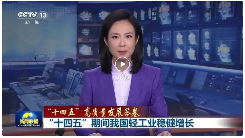 10月15日,央视《新闻联播》【“十四五”高质量发展答卷】援引中国轻工业联合会权威信息,报道轻工业“十四五”发展成就。报道指出,“十四五”期间,我国轻工经济总量持续增长,市场优势不断巩固,品牌竞争力大幅提升,产业发展坚实有力。(全文如下)