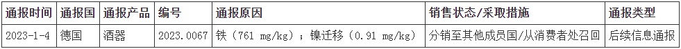 据欧盟食品饲料类快速预警系统(RASFF)消息,2023年1月4日,欧盟通报我国出口酒器不合格。具体通报内容如下: