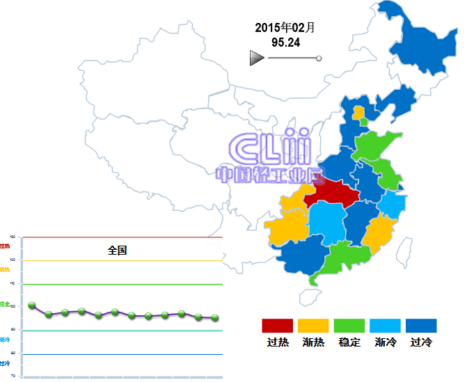 2月,湖北省过渡到“过热”区间;北京、重庆、四川、福建四省区处于 “渐热”区间;北京、山东、江苏、广东四省区处于“稳定”区间;浙江、湖南省处于“渐冷”区间;下图中蓝色区域的省区处于“过冷”区间。(参见图1-3)