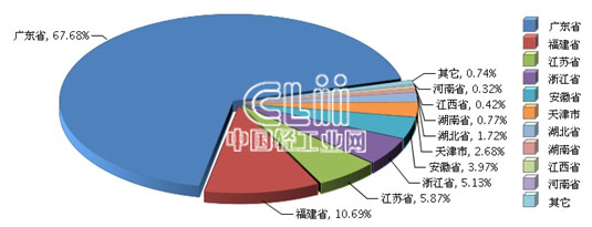 2015年1~6月,全国发光二极管(LED)累计产量1774.54亿只,同比增长37.33%。比重主要集中在广东省、福建省、江苏省、浙江省、安 徽省等地区。其中:广东省完成累计产量1201.05万万只(占67.68%),同比增长58%。