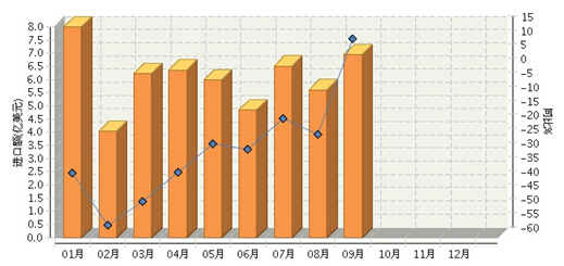 2015年1~9月,全国食品行业累计完成进口额54.52亿美元,同比下降31.88%。其中:1月份完成进口额8亿美元,同比下降37.05%;2月份完成进口额4.04亿美元,同比下降55.57%;3月份完成进口额6.23亿美元,同比下降47.16%;4月份完成进口额6.36亿美元,同比下降36.62%;5月份完成进口额5.99亿美元,同比下降26.5%;6月份完成进口额4.85亿美元,同比下降28.72%;7月份完成进口额6.5亿美元,同比下降17.65%;8月份完成进口额5.6亿美元,同比下降23.3%;9月份完成进口额6.93亿美元,同比增长10.72%。