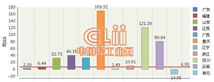 2015年1~12月我国陶瓷砖主要出口地区中,出口额增速前三地区:重庆、四川、云南,均为西部地区,出口额同比增速均在80%以上。出口额占比居前两位的广东、福建出口增速均低于全国平均增速;在出口额前十地区中,辽宁增速垫底,详见图2。