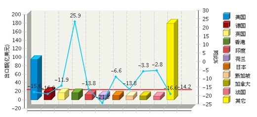 从出口国别来看,比重主要集中在美国、德国、英国、香港、印度等地区。其中:美国完成累计出口额94.12亿美元(占24.44%),同比增长-15.55%;德国完成累计出口额19.51亿美元(占5.07%),同比增长-16.58%。