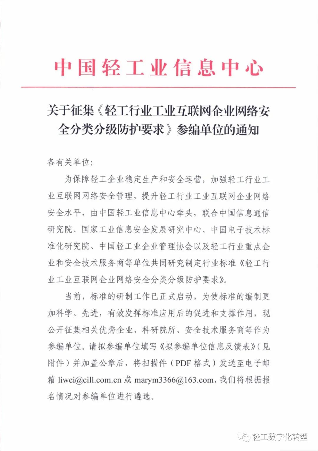 2023年5月15日,工信部印发2023年第一批行业标准制修订和外文版项目计划,《轻工行业工业互联网企业网络安全分类分级防护要求》行业标准正式获批立项。
