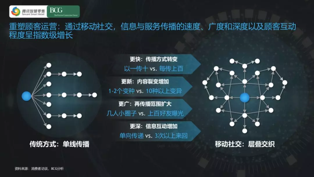社交与社群是基于微信生态独特的商业环境,在微信的土壤里诞生了诸多社交电商、社区拼团,这些就是最好的案例。在今年10月腾讯和BCG联合发布《新时代的中国消费者互动模式》报告中提到,通过移动社交,信息与服务传播的速度、广度和深度以及顾客互动程度,呈指数级增长。