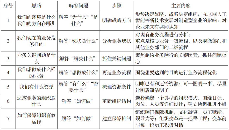 对于推行智慧制造的传统企业,进行组织结构变革的思路和操作步骤是:我们的方向在哪儿→现在业务是怎样的→业务关键问题是什么→想做成什么样的业务→有什么资源→适应业务的组织是什么→如何保障组织有效运作。详细的组织结构变革的思路逻辑与实施路径请见下页表 1。