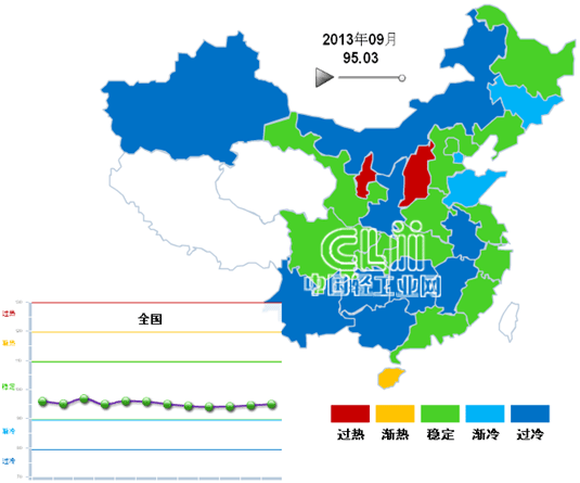 中国轻工业信息中心发布2013年9月中轻家具景气指数。9月,中轻家具景气指数95.03,其中:主营业务收入景气指数为93.70,出口景气指数为98.65,资产景气指数为103.49,利润景气指数为90.89(图1)。