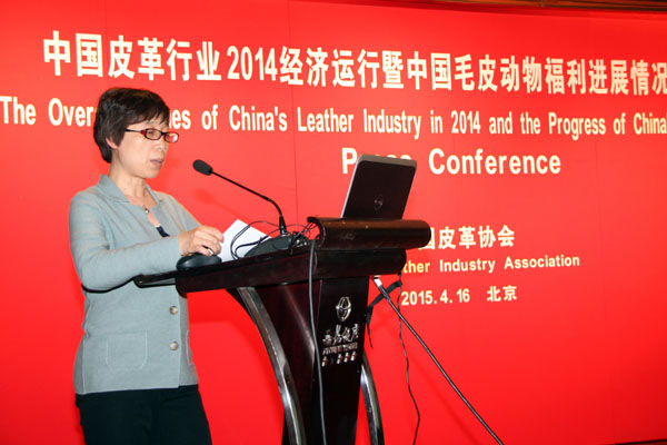 中国皮革协会副秘书长叶香菊介绍我国皮革行业2014经济运行情况 摄影:贾冬