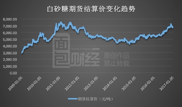 根据郑州商品交易所最新数据,2017年1月6日国内白砂糖期货结算价为6811元/吨,尽管较去年底略有回调,但仍然处在历史高位,较2014年低增长约50%。