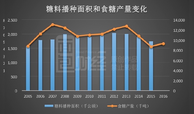 食糖产量在过去几年的缩减更为严重。2013年,中国食糖产量高达1275万吨,到2015年时减少到870万吨,减少了31.76%。2016年,产量有所回升,但也仅有930万吨,远低于过去10年的平均产量。下图是面包财经根据统计数据绘制的糖料播种面积和食糖产量变化趋势图: