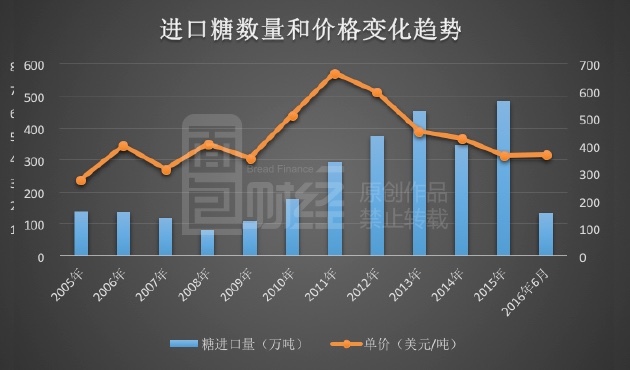 与国内食糖相比,进口食糖还存在明显的价格优势。统计数据显示:即便是对进口糖征收50%的关税,2016年上半年进口食糖均价折合人民币约2530元/吨,仍不到同期国内食糖价格的一半。下图是面包财经根据商务部数据绘制的进口食糖数量和价格变化趋势图: