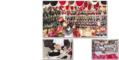 春节临近,江苏海安县城乡的一些传统手艺人正抓紧制作各式布鞋,准备供应节日市场。手工布鞋就是人们常说的“千层底”。海安县民间有春节穿布鞋的习俗,寓意新年新鞋新气象。手工布鞋以废旧棉布、棉线为原料,需要经过糊布骨、剪鞋样、纳鞋底、缝鞋帮、绱鞋、楦鞋等十几道工序。每双鞋的鞋底一般要粘二十几层布,纳制需消耗棉线二十余米,缝制1000多针。与做衣服相比,制鞋要精细得多,5毫米就是一个尺码,误差3毫米,鞋子就会太挤或者不跟脚,因而需要手艺人有娴熟技艺。 在海安县李堡镇菜市场一侧有个不起眼的布鞋小店,门口的台子上、屋里和墙上摆放了各种小巧玲珑的娃娃布鞋、时尚新潮女式方口鞋……今年56岁的房州平是这个小店的主人,他每天从早到晚,一针一线地缝制手工布鞋,这一做就是37年。房州平是海安县李堡镇李堡村的普通农民。他自幼左腿患有小儿麻痹症,4级肢残,行走困难,为了生活,他克服重重困难,20岁开始拜师学习制作手工布鞋。几十年来,房州平练就了一手制作手工布鞋的娴熟技艺。经他一针一线纳出的各式布鞋,吸引了来自四面八方的顾客,还远销至周边乡镇及上海、苏州、南通等城市。“靠着这些年卖布鞋的积蓄,我供孩子读完了大学,并成家立业。”房州平说。 向中林摄影报道