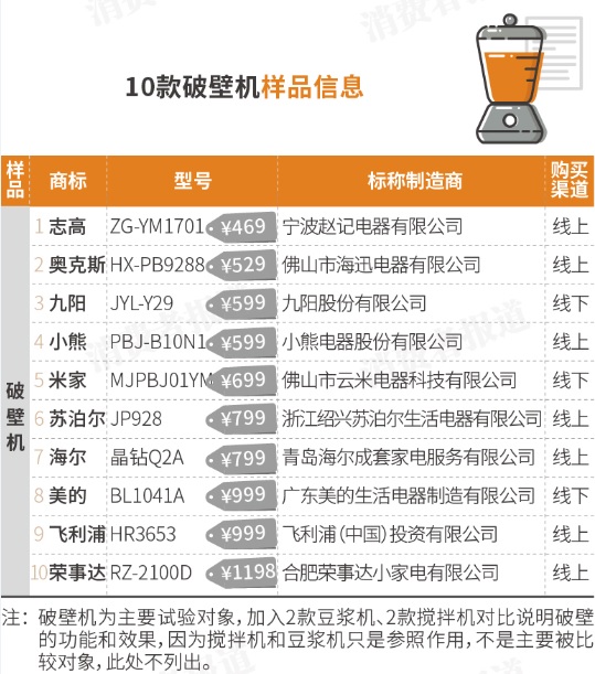 本次比较试验选购样品涉及10个品牌,共计14款。其中10款破壁机,2款豆浆机,2款搅拌机。