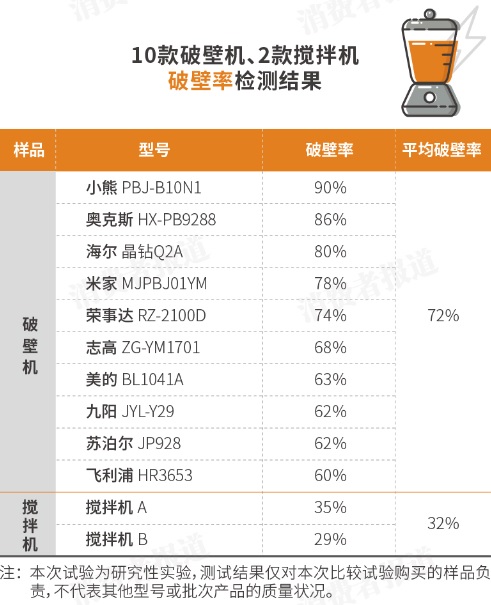 试验结果显示,10款破壁机的平均破壁率高达72%,而2款搅拌机的平均破壁率仅为32%。所以破壁机确实有一定的“破壁”效果。