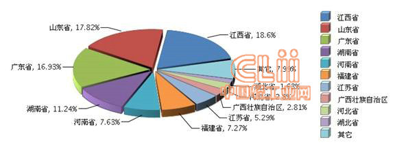 2013年1~9月陶瓷行业规模以上企业累计完成主营业务收入占比达一成以上的地区依次是江西、山东、广东、湖南。其中:江西同比增长19.52%,占18.6%;山东同比增长11.5%,占17.82%;广东同比增长15.47%,占16.93%;湖南同比增长15.74%,占11.24%。上述前三个地区2013年1~9月累计完成主营业务收入均突破300亿元。详见图4。
