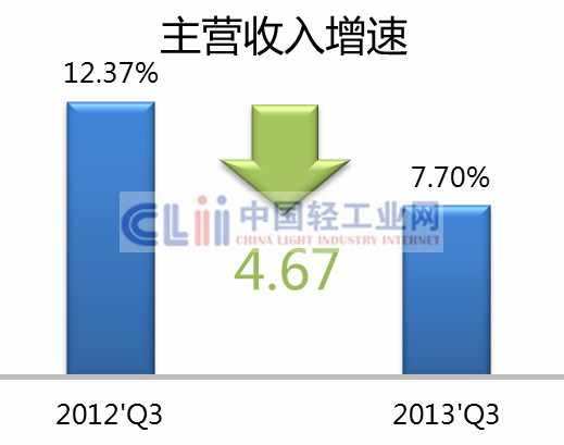 2013年1月~9月,全国日化行业累计完成主营业务收入同比增长7.70%。其中:9月份同比增长5.9%。2013年前三季度主营业务收入增速较去年同期下降4.67个百分点。