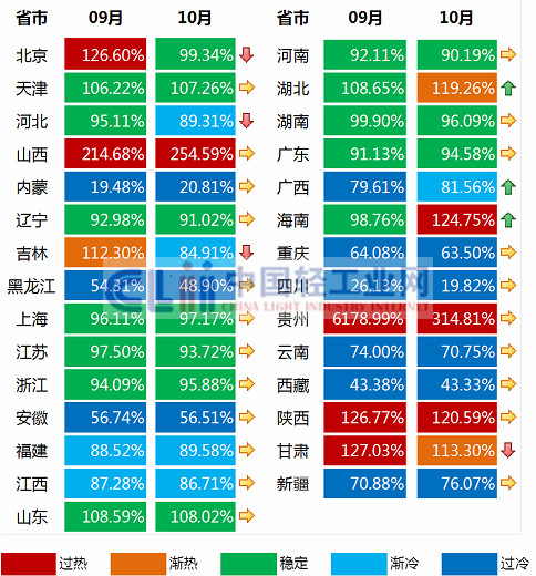图3 2013年9月-10月各地区日化景气指数运行区间变动情况