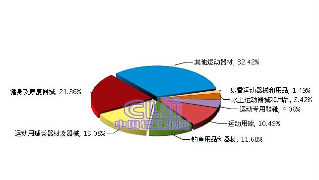 2014年1月~9月,全国体育用品及户外游乐设备行业完成累计出口额90.11亿美元,同比增长10.83%。其中,其他运动器材完成累计出口额29.22亿美元(占32.42%),同比增长14.35%;健身及康复器械完成累计出口额19.25亿美元(占21.36%),同比增长14.98%;运动用球类器材及器械完成累计出口额13.59亿美元(占15.08%),同比增长4.65%;钓鱼用品和器材完成累计出口额10.52亿美元(占11.68%),同比增长5.27%;运动用球完成累计出口额9.45亿美元(占10.49%),同比增长9.59%;运动专用鞋靴完成累计出口额3.66亿美元(占4.06%),同比增长9.6%;水上运动器械和用品完成累计出口额3.08亿美元(占3.42%),同比增长11.8%;冰雪运动器械和用品完成累计出口额1.34亿美元(占1.49%),同比增长2.04%。