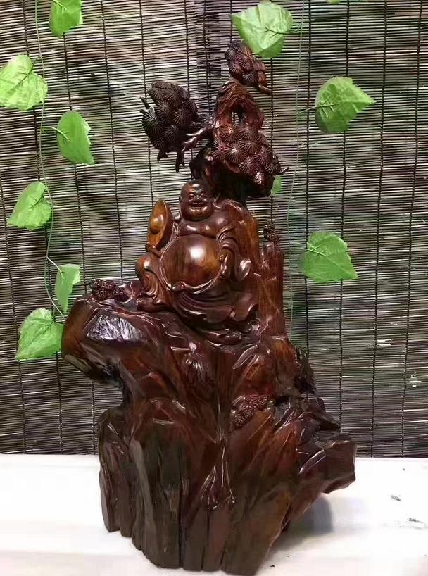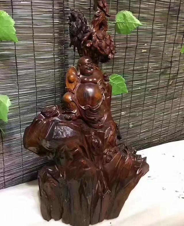 上周末老王和朋友去喝茶,在一家茶馆看到一尊雕工非常细致的木雕弥勒,倚着一棵松树,一手抱着一个大元宝,一手摸着自己的圆肚子,慈眉善目笑呵呵的。