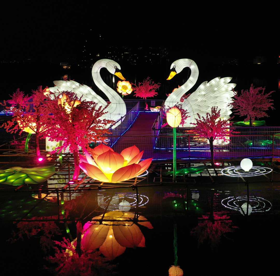 本次灯会将盘锦的湿地文化、自然景观、人文风貌等融入其中。66组大型灯组凸显“高大新奇美”的彩灯艺术特色。10万盏花灯星罗棋布,营造45万平米绚丽场景。《醉美辽河湾》《鼓舞中华》《辉煌百年》等巨型彩灯给人带来视觉震撼。另外,自贡三绝的瓷器灯、水晶灯也绚丽呈现。《醉美辽河湾》是本届灯会体量最大的一组水上灯组,占地6000平米水上灯景,打造大型沉浸式灯群,以灯光、真人演艺、雾森、呐喊泉等,勾勒出诗意曼妙的三生三世十里桃花梦幻河湾风景。白天与夜晚形成不同的景观效果,配合灯光、雾森、真人演绎、声音等营造浪漫温馨的体验感,打造创意十足的“网红打卡地”。为方便观赏,灯会举办方专门为游客修建了300米长的水中栈桥,游客可以近距离欣赏与水中倒影遥相呼应的美景。