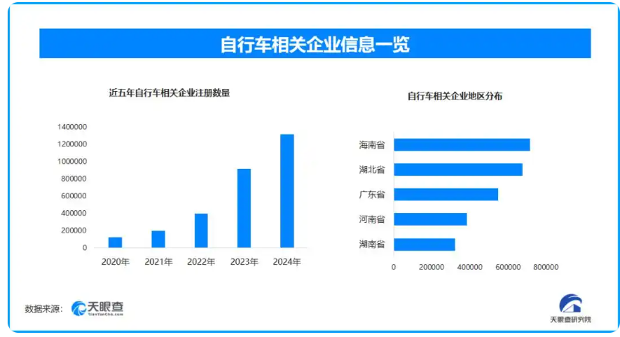天眼查专业版数据显示,截至目前我国现存在业、存续状态的自行车相关企业超457.9万家。其中,2025年截至目前新增注册相关企业约107.5万家,从企业注册数量趋势来看,近五年间,自行车相关企业的注册数量呈现出逐年增长的态势,并在2024年达到顶峰。从区域分布来看,海南省、湖北省、广东省自行车相关企业数量位居前列,三个省市数量总和超过193.6万余家,占企业总数的42.3%。