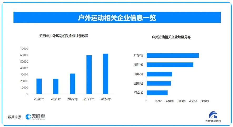 天眼查专业版数据显示,截至目前我国现存在业、存续状态的户外运动相关企业超35.4万家。其中,2025年截至目前新增注册相关企业约5万余家,从企业注册数量趋势来看,近五年间,户外运动相关企业的注册数量逐年增长,并在2023、2024两年间呈现高位增长态势。从区域分布来看,广东省、浙江省户外运动相关企业数量位居前列,两个省市数量总和超过8.5万余家,占企业总数的23.96%。