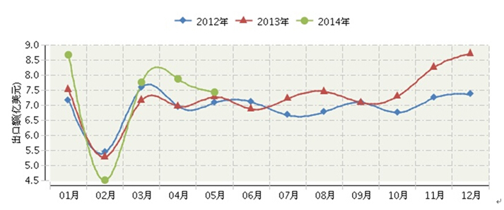 图 2012~2014年全国食品行业连续两年月度出口额对比