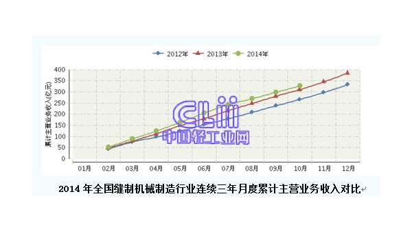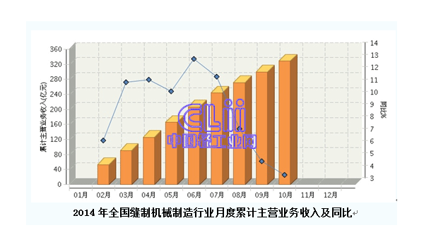 2014年1月~10月,全国缝制机械制造行业累计完成主营业务收入328.47亿元,同比增长3.76%。月度主营业务收入增速自7月份以来持续下滑, 1月~6月份完成累计主营业务收入206.52亿元,同比增长13.23%; 1月~10月份完成累计主营业务收入328.47亿元,同比增长3.76%。