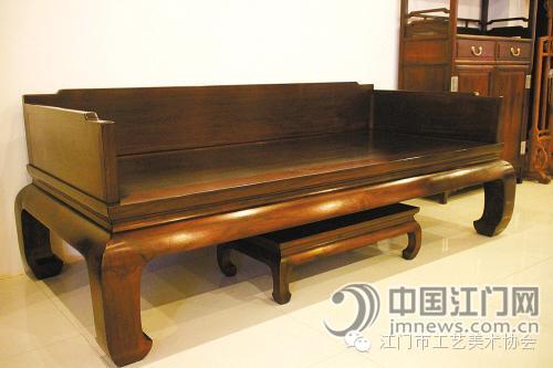 床身通体用大红酸枝制成。床面之上左右及后面的三块围子,系用三块酸枝整板做成,不加雕饰,其目的在于充分显示酸枝木块的自然特点和优美的纹理,这种简约的作法在如今的仿明代古典家具中也并不多见。