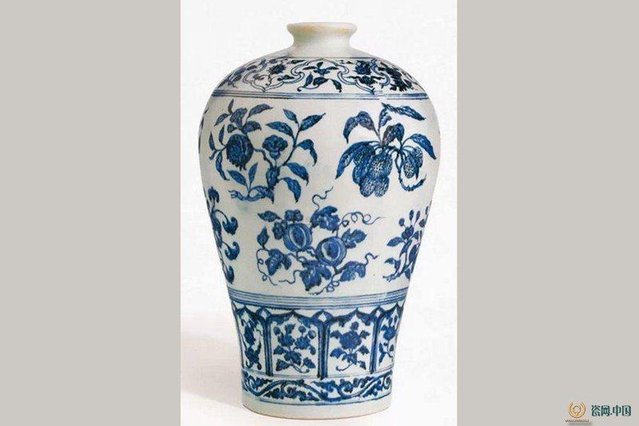 梅瓶绘折枝果纹以明朝永乐年间最为出名,此瓶身巨大,上饰十组折枝瑞果纹样,主题构图延展、图案分布合理、绘画风格柔美,是世界上最精炼的私人御制瓷器收藏之一。1998年类似的瓷瓶曾以1200万元由苏富比拍出。