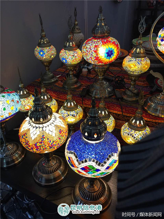 远远望去一片霓虹,土耳其带来了色彩绚烂的马赛克灯。说得一口流利中文的参展商向围观者介绍,这些灯都是由彩色玻璃敲碎之后,再通过手工艺人的手焊接而成。