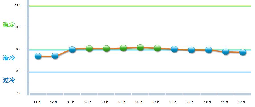 中国轻工业经济运行及预测预警系统数据显示:2018年,中轻景气指数全年均在蓝色“趋冷”区间波动,走势稳中略降。 12月中轻景气指数为87.47,环比11月下降0.51点,较去年同期下降1.62点。