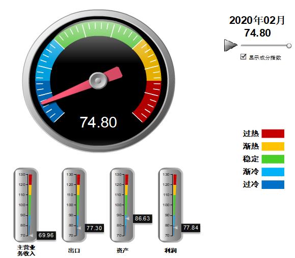 分项景气指数中,除资产景气指数外,其他分项指数均较上年末下降,且均跌入“过冷”区间,营业收入和出口景气指数跌幅较大,其中:营业收入景气指数69.96,位于“过冷”区间,较上年末下降11.42点;出口景气指数为77.30,位于“过冷”区间,较上年末下降10.78点;资产景气指数为86.63,位于“渐冷”区间,较上年末回升2.16点;利润景气指数77.84,位于“过冷”区间,较上年末下降1.27点。