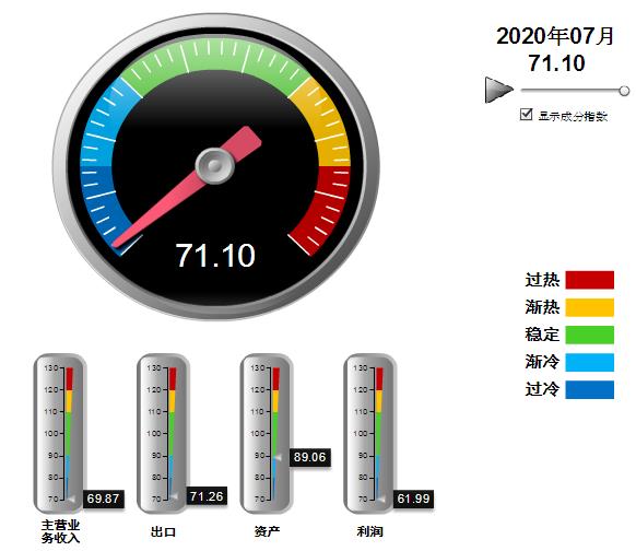 分项景气指数中,利润、出口、资产景气指数环比上月回升,营收景气指数环比下降。其中:营业收入景气指数69.87,位于“过冷”区间,环比下降0.46点;出口景气指数为71.26,位于“过冷”区间,环比上升3.92点;资产景气指数为89.06,位于“趋冷”区间,环比上升0.38点;利润景气指数61.99,位于“过冷”区间,环比上升5.72点。