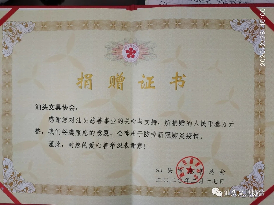为深入贯彻习近平总书记的重要指示和李克强总理的重要批示精神,认真落实党中央、国务院和省委、省政府,以及市委、市政府的工作部署,更广泛地动员社会慈善力量,依法有序支持疫情防控工作,汕头文具协会就本次全国性新冠肺炎疫情,本着发挥协会优势,动员协会力量,汇集会员爱心,发挥一方有难八方支援的优良传统精神。汕头文具协会向汕头市慈善总会捐款人民币3万元作为购买疫情防控物资所用,协助党和政府遏制疫情蔓延势头尽协会绵薄之力。